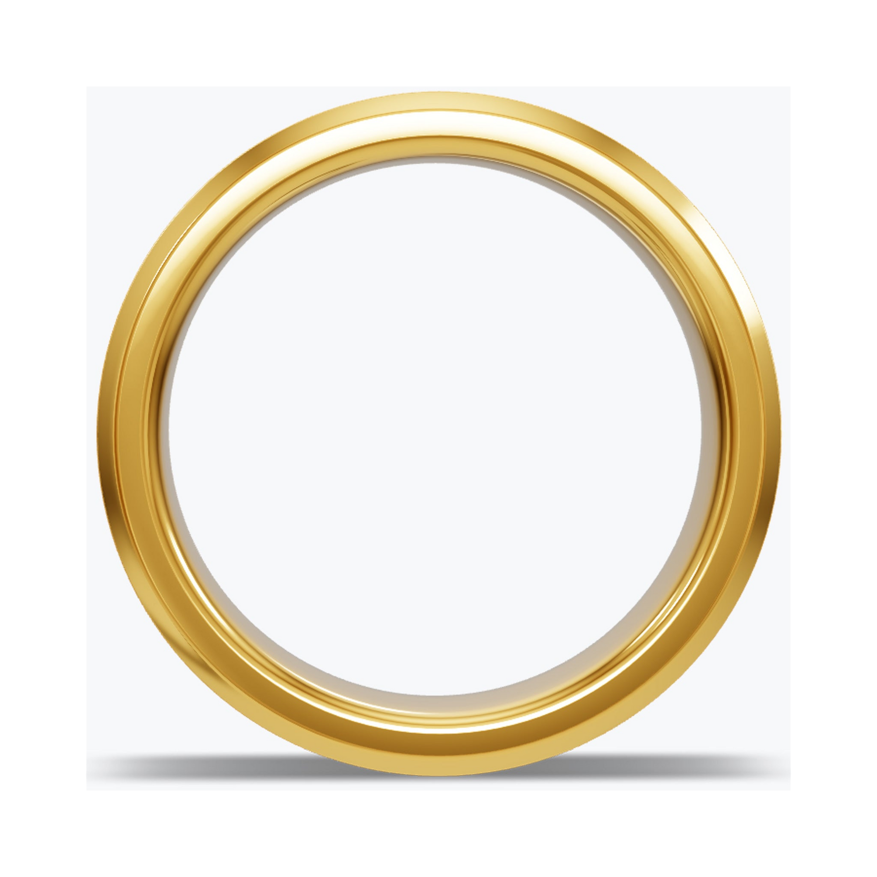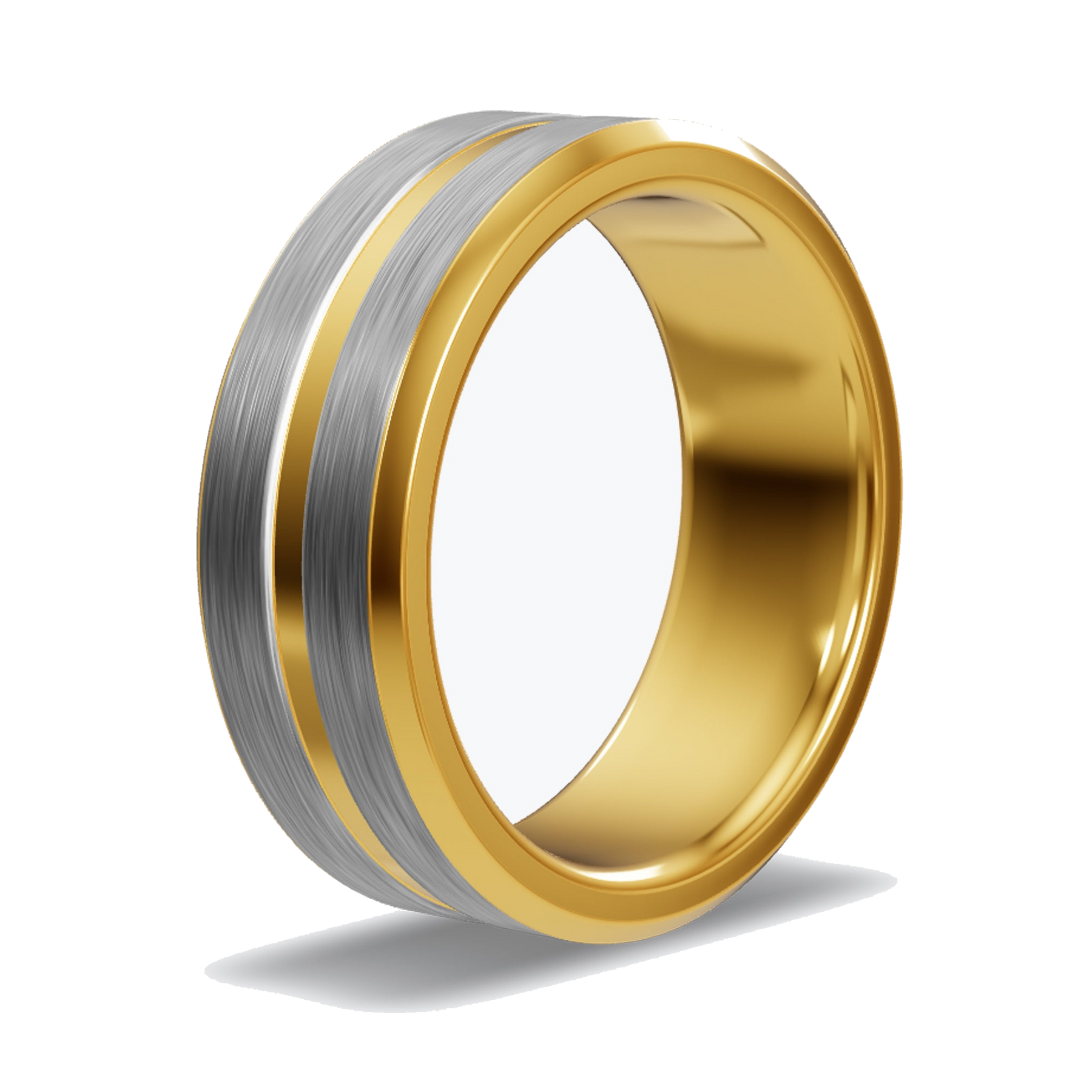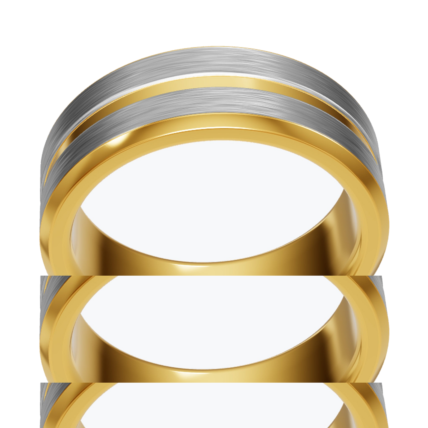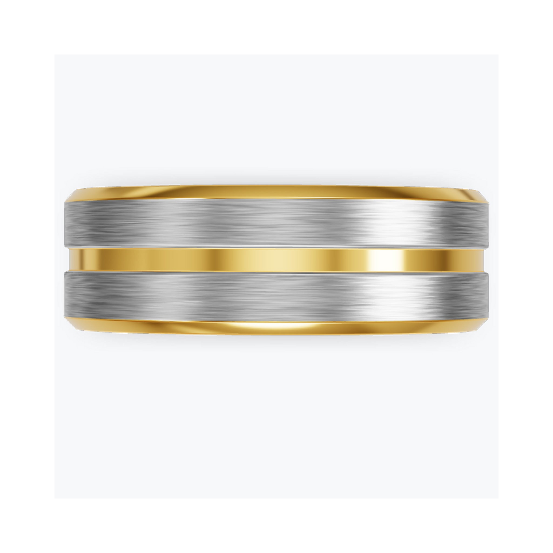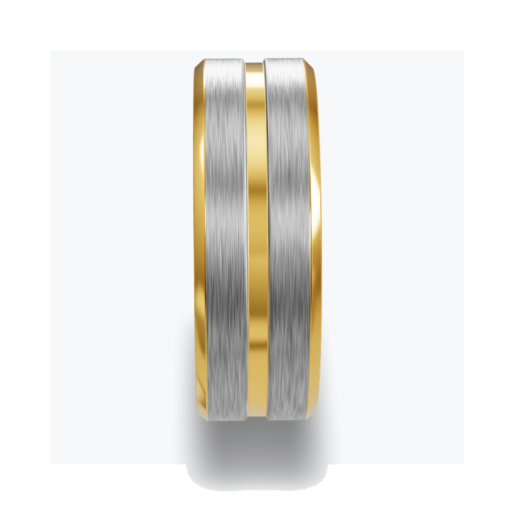 Brushed silver center, beveled at both edges into polished gold. The two tones meet in a hard line — no gradient, no blend. Silver where the light hits flat; gold where the ring steps down.